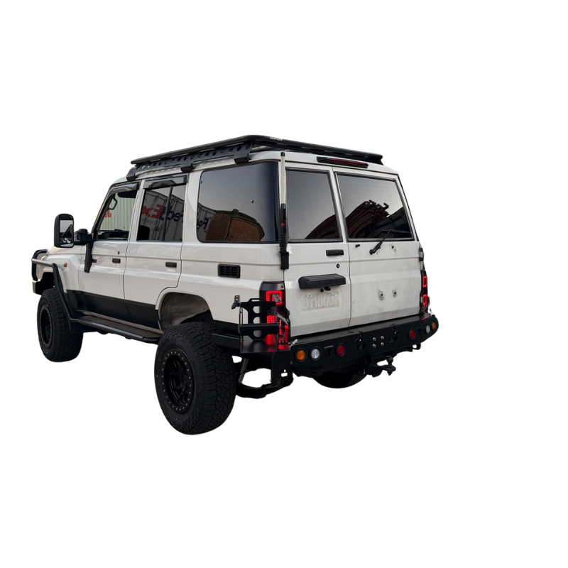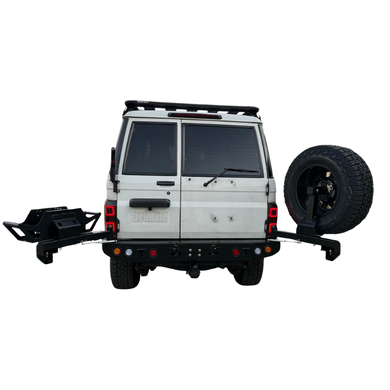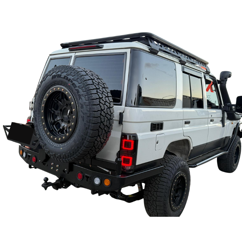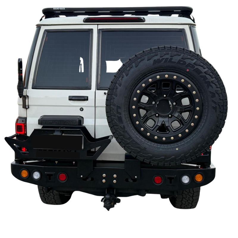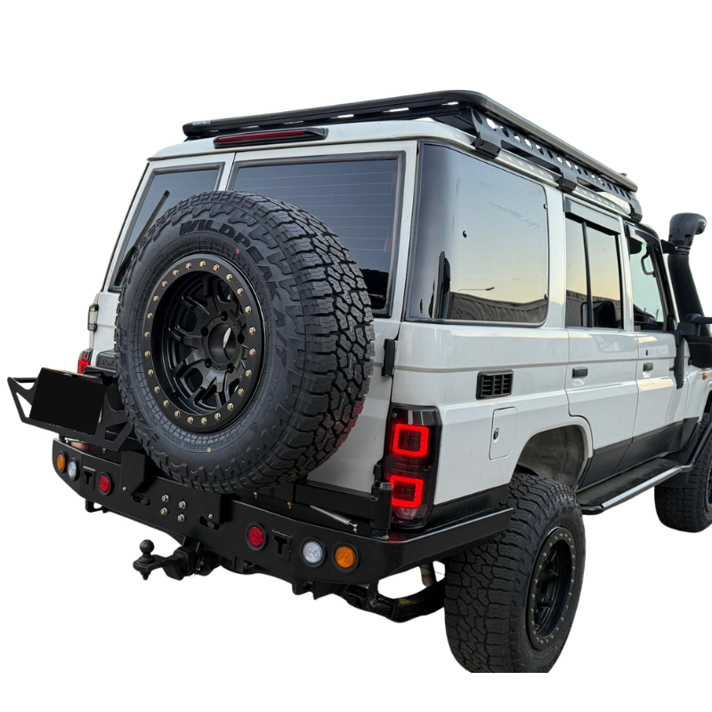 Rear Bar Suitable for Toyota Land Cruiser 76 series year 2007 – 2022 Full Rear bar replacement original rear bar Stay in Place. And Tow bar Included 1 Piece 1 Unit original Rear Plastic Bar will need to be removed, Comes with Led Tail Lights, and Two Swing Arm’s with a Single Jerry can Holder it’s your choice to install this or you can have two tyres on the back or one spare tyre and a jerrycan' the choice is yours.