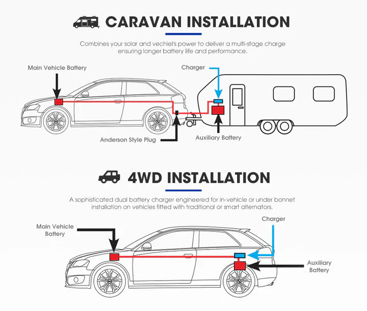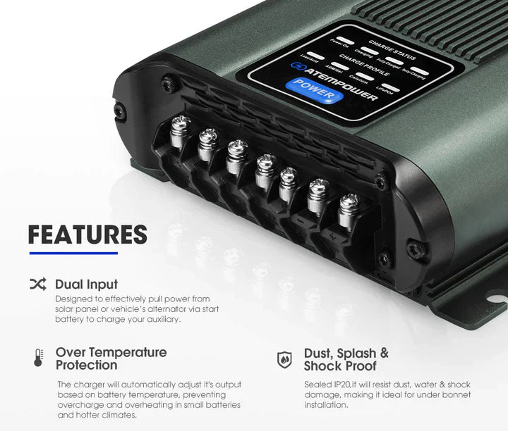 • Dual Input: This Charger is designed to effectively pull power from solar panel (up to 20A) or vehicle’s alternator to charge your auxiliary battery.