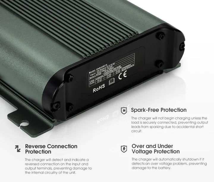 • Multi-Stage Charging: This charger integrates standby, pre-charge, constant current charging, constant voltage charging, full charge and re-charge.