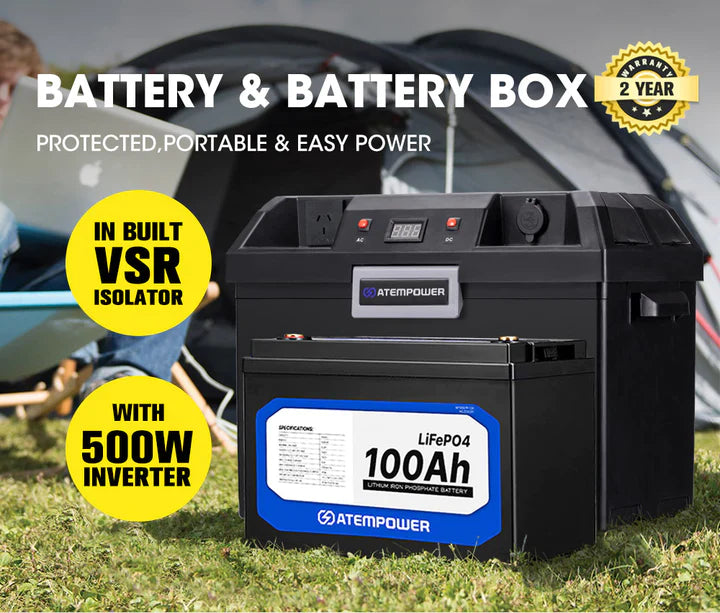 ATEM POWER Battery Box built-in VSR Isolator with 500W Inverter + 12V 100Ah Lithium Battery