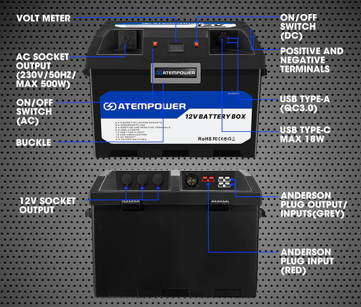 A battery box will instantly turn your battery into a portable power hub. This ATEM POWER RV battery box gives you reliable power options to make your battery functional. All the sockets on the battery box are pre-wired – just connect your battery to the positive and negative terminals and you’re ready to go. This marine battery box comes with 3 cigarette lighter sockets, 3 USB ports which support fast charging protocols, 2 Anderson plug outputs and an AC socket to charge multiple electronic devices. Unlike most other models on the market, all Anderson plugs are recessed into the body to reduce likelihood of damage. And the red Anderson plug features a VSR which allows the battery in the RV battery box to charge from the crank battery and automatically cuts the link between the two batteries when the voltage drops below 12.5V. With this 12V battery box, you can power 230V appliances, camp lights, fridges, charge phones, tablets and plenty more wherever you go.