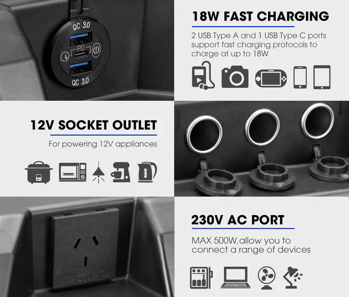 • Versatile Functionality: With this 12V battery box, you can power 230V appliances, camp lights, fridges, charge phones, tablets, and plenty more.