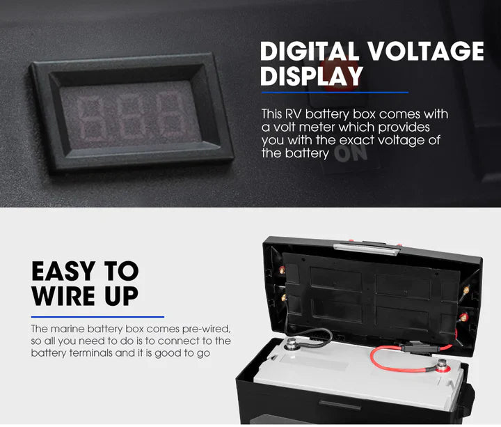 • Digital Voltage Display: This RV battery box comes with a volt meter which provides you with the exact voltage of the battery.