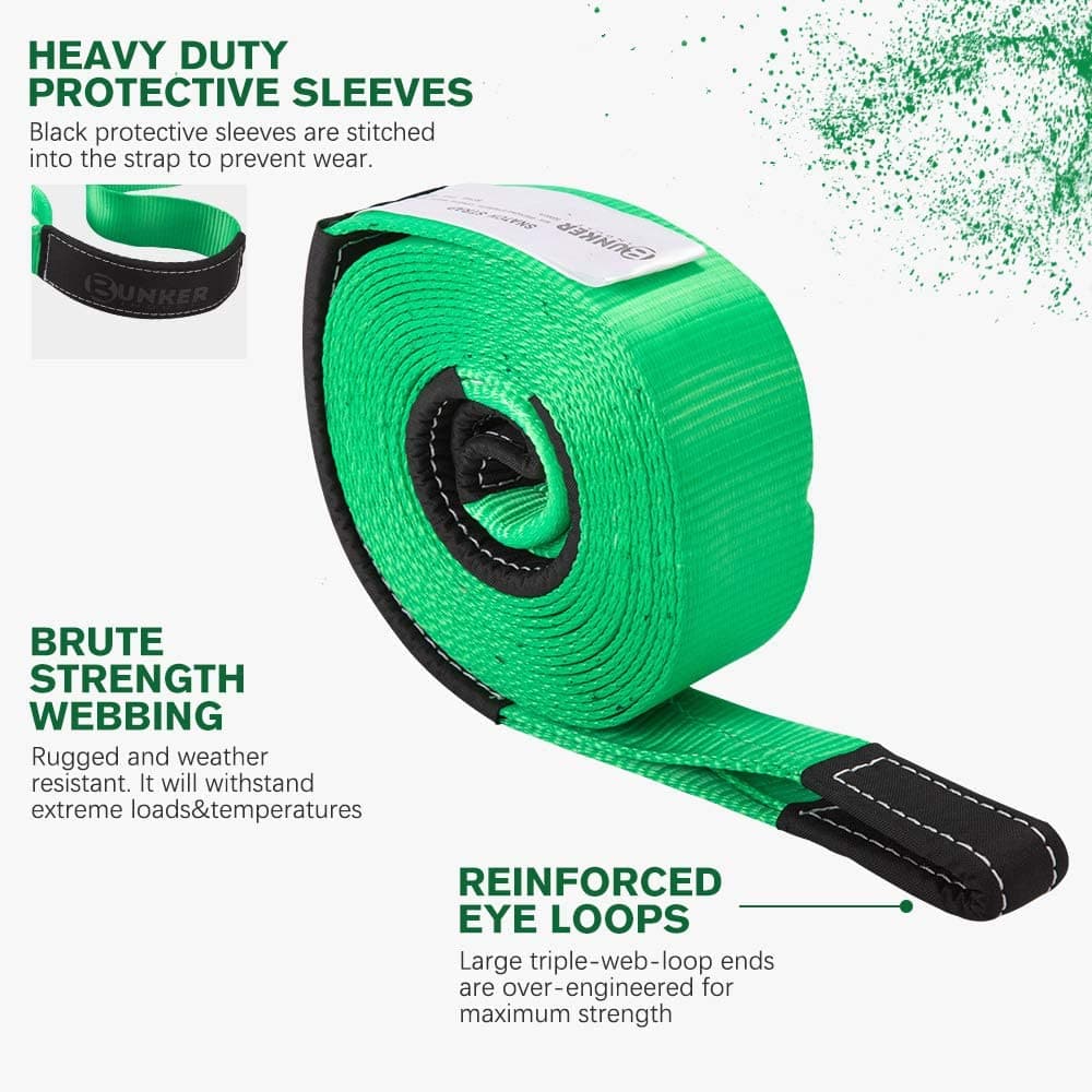 • Wear Points Protection: If you are an overlanding enthusiast, a recovery strap is a must-have but finding a recovery strap that will not fray, tear, or wear down quickly is not easy. This BUNKER winch tree saver strap comes with protective sleeves, which are made of durable polyester and SBR, to protect the tow strap where the tow strap comes in contact with other objects.