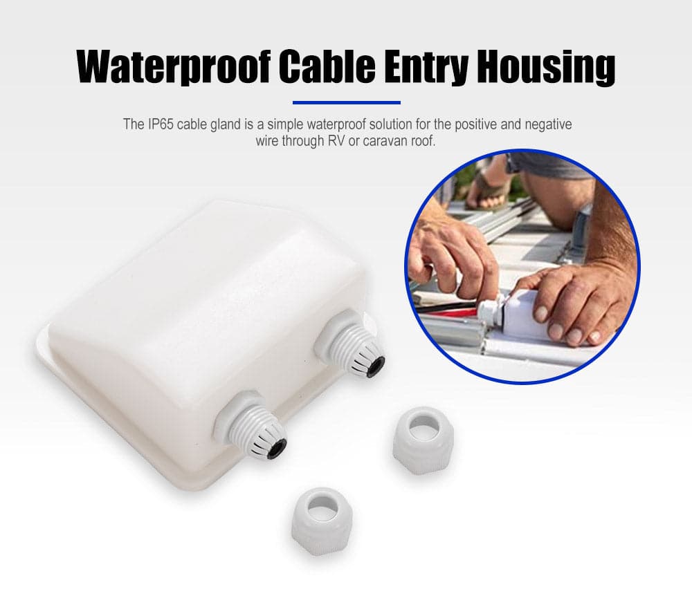 Attaching solar panels to the roof of your caravan may sound like a straight forward procedure if you don’t mind drilling holes on the roof. But if you prefer not to drill holes, these ATEM POWER solar panel brackets provide a drill-free yet secure solution. Made of non-corrosive, UV stable and 100% recyclable ABS, these drill-free solar panel mounting brackets can be used with aluminium frame panels of different sizes without any modification. You stick or screw your panel onto these solar panel mounting brackets, and then simply stick the solar panel mounting brackets with the panel onto your RV, caravan, boat or rooftop. The solar panel mounting brackets will keep the solar panel with adequate space underneath for cooling in high temperatures. And the IP65 cable entry housing in the solar panel mounting kit is a simple waterproof solution to avoid unsightly and potentially leaky cable entries.