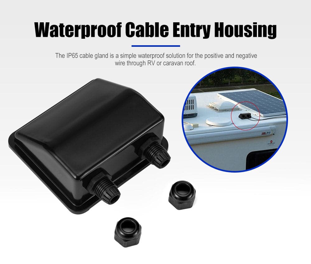 - Waterproof Cable Entry Housing: The IP65 cable gland is a simple waterproof solution for the positive and negative wire through RV or caravan roof.