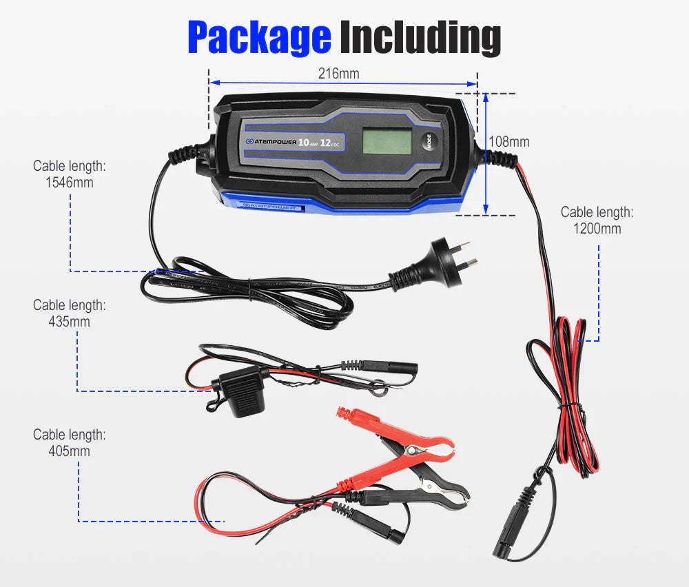 - Smart Charging: Our charger automatically detects battery voltage, smoothly switches charging modes, and employs a 10-stage algorithm for 3-135Ah batteries.