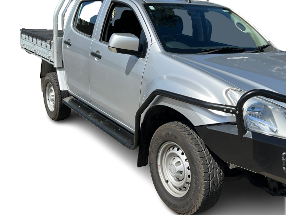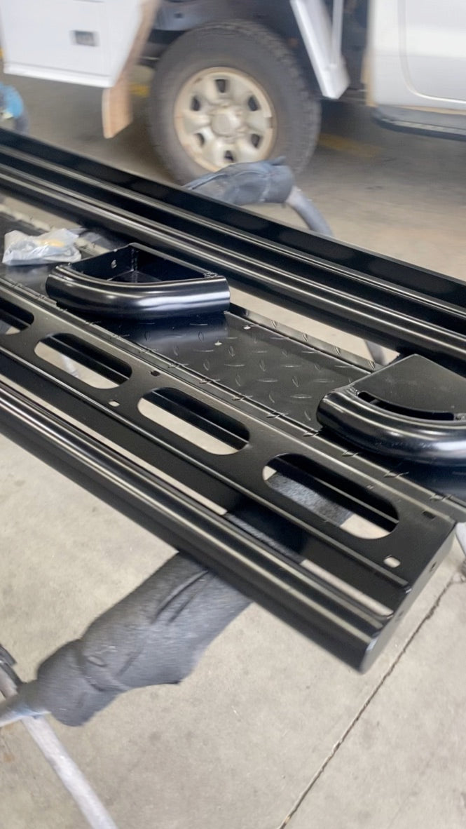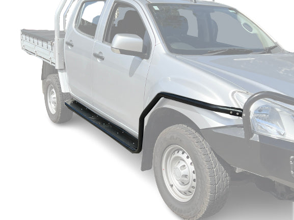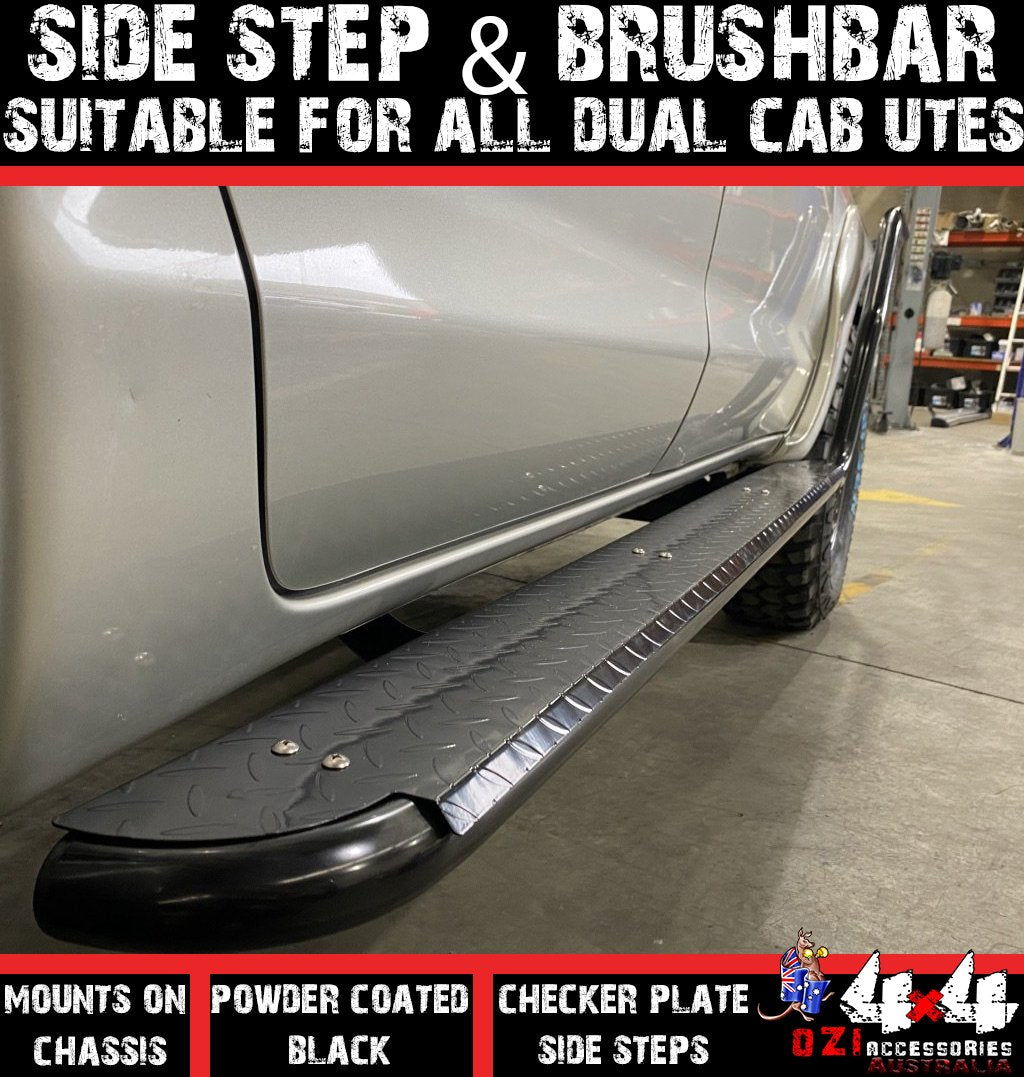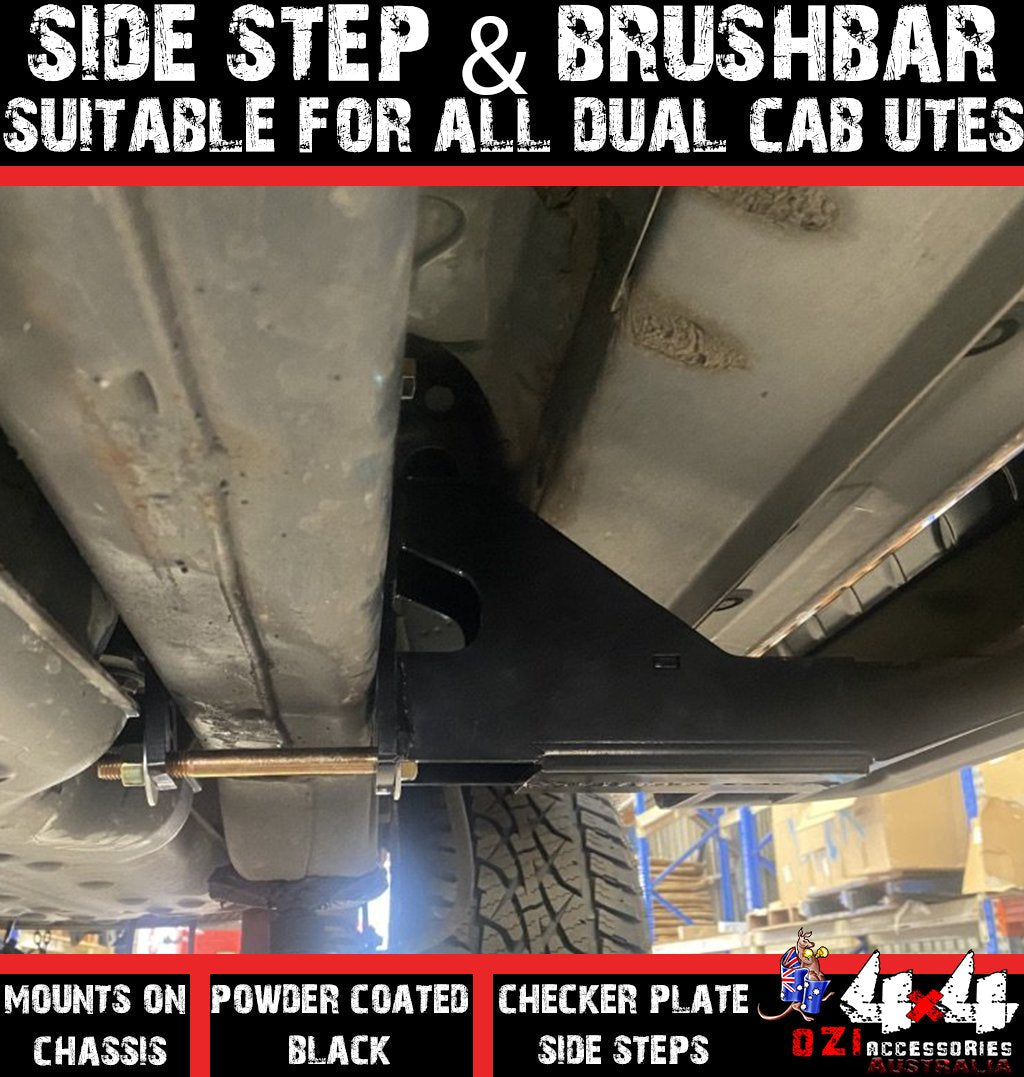 They have been designed to fit on any Dual Cab UTE they bolt on to the chassis just like every other slider on the market. The Steps have arms which move to bolt anywhere on to the chassis where you would like to position the arms, they bolt on to the side steps instead of the old design of being fixed. They allow 4x4 Goers to choose the place that suits them to locate the arms with same design of nut and bolt which go above and below the chassis with a plate of steel on the other side of the chassis. which lock the sidestep on to the chassis the brush bars are exactly the same as other rock sliders on the market they do come longer the reason being this is that you can install on any Bullbar on the market as every Bullbar is unique and the loops are sometime closer to the vehicle or some time further out away from the vehicle the Brush bars always need cutting to the desired position to lock with the Bullbar.