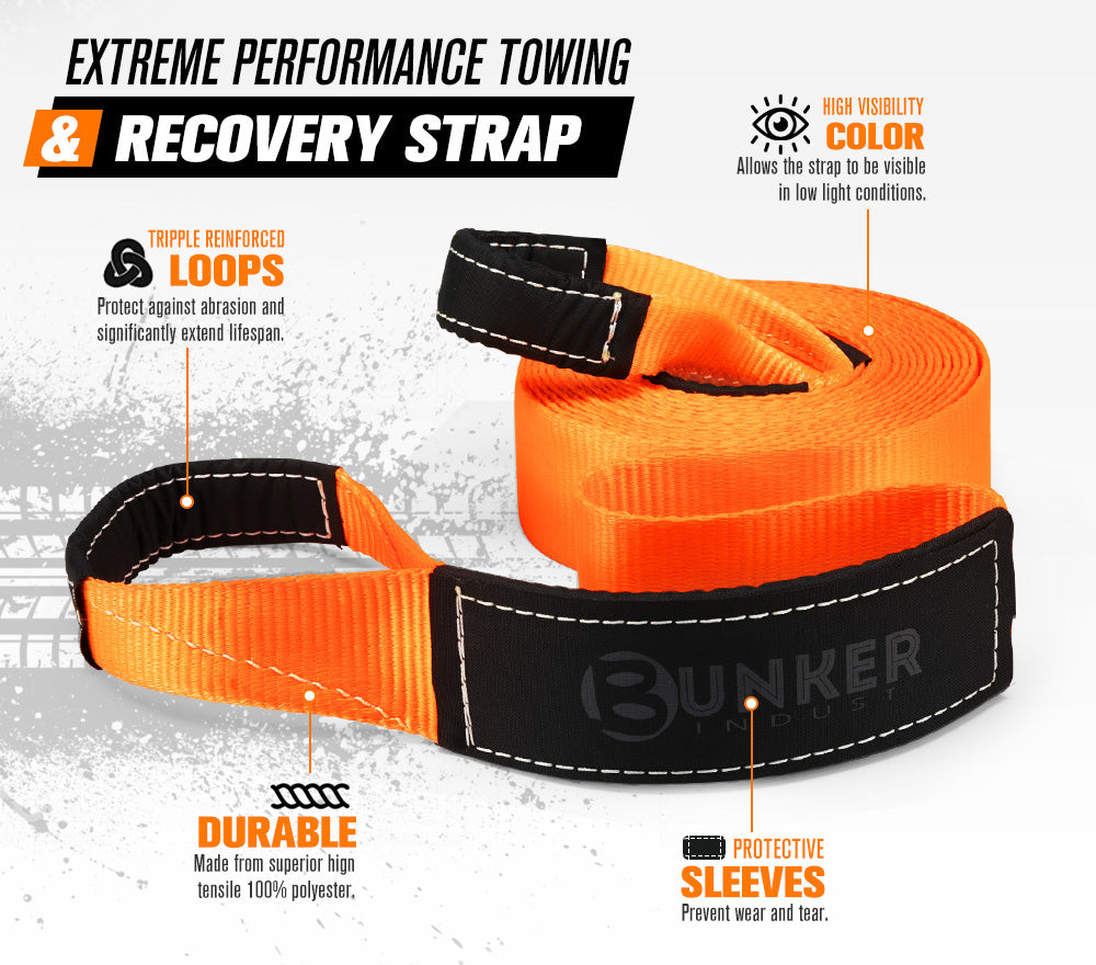 • Solid Snatch Strap: This BUNKER INDUST snatch strap, which is made of Polyester and measures 30ft, has a breaking strength of 32,000 lbs to pull out your vehicles from mud and other awkward settings.