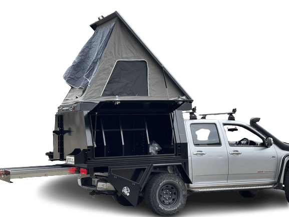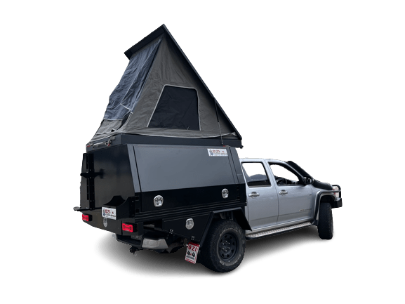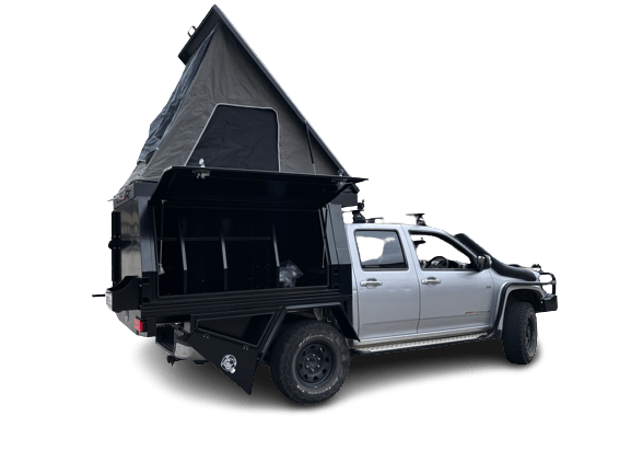 The body and sides of the tent are made from Heavy Duty Aluminium that’s used for our trays and Canopies weatherproof, so you’ll be nice and snug in your tent, regardless of the weather. If it’s cold outside you can zip the front flap closed and if it’s hot you can leave the flaps open and enjoy the breezes flowing through the fly mesh. There’s also a rear awning for additional shade. When you pack it all away and head off down the road, the protective shell (made from powder coated honeycomb aluminium panel) and a rubber seal keep everything safe from the weather.