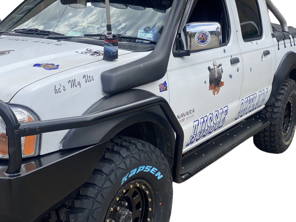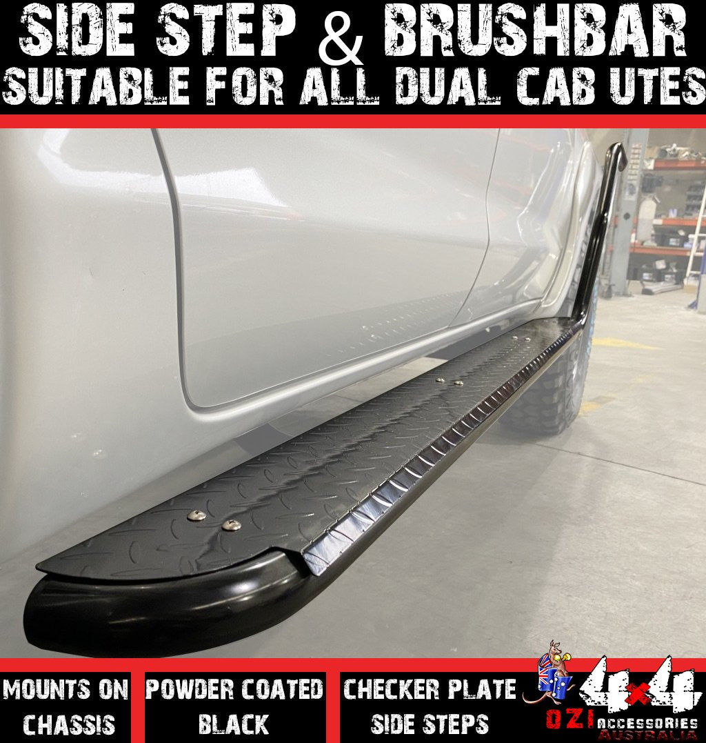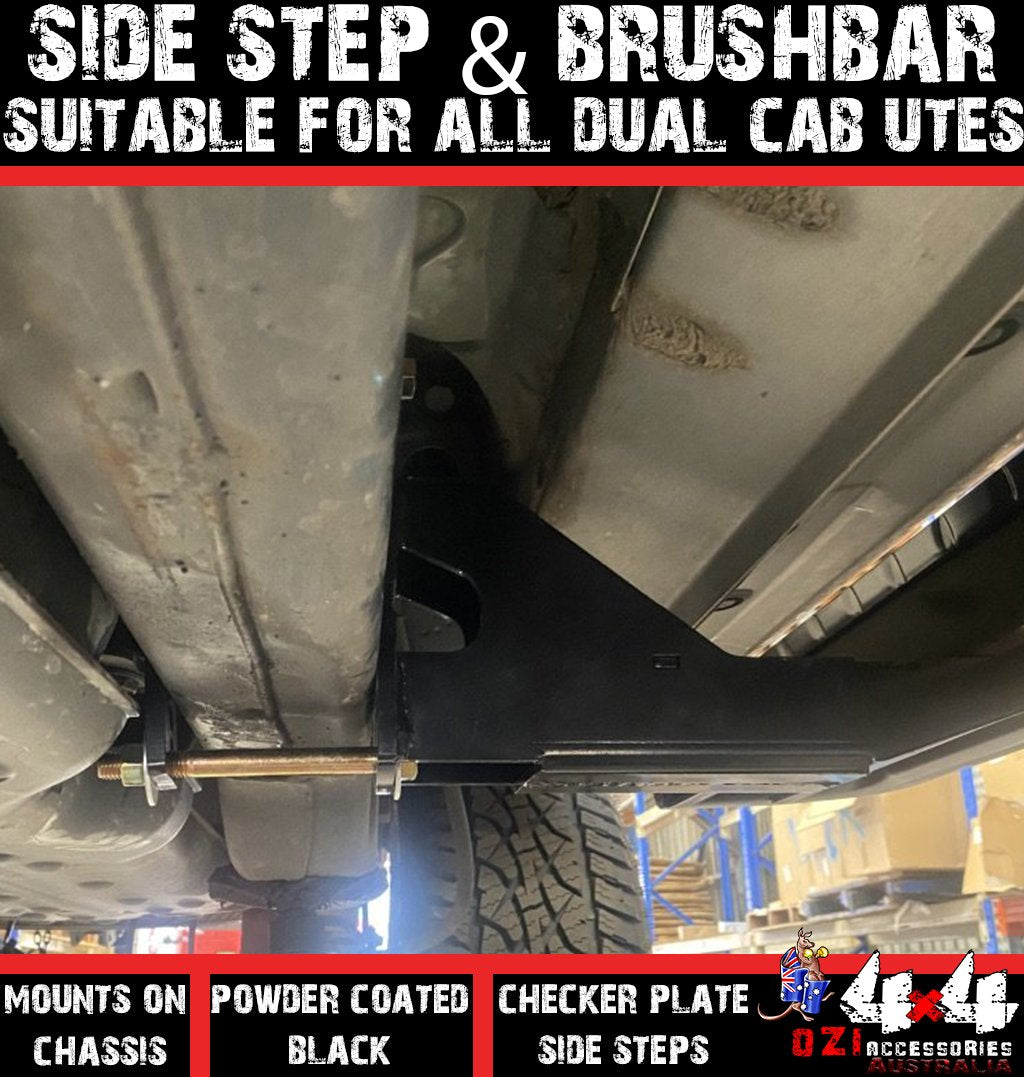 They have been designed to fit on any Dual Cab Ute they bolt on to the chassis just like every other slider on the market. The Steps have arms which move to bolt anywhere on to the chassis where you would like to position the arms, they bolt on to the side steps instead of the old design of being fixed. They allow 4x4 Goers to choose the place that suits them to locate the arms with same design of nut and bolt which go above and below the chassis with a plate of steel on the other side of the chassis. which lock the sidestep on to the chassis the brush bars are exactly the same as other rock sliders on the market they do come longer the reason being this is that you can install on any Bullbar on the market as every Bullbar is unique and the loops are sometime closer to the vehicle or some time further out away from the vehicle the Brush bars always need cutting to the desired position to lock with the Bullbar.