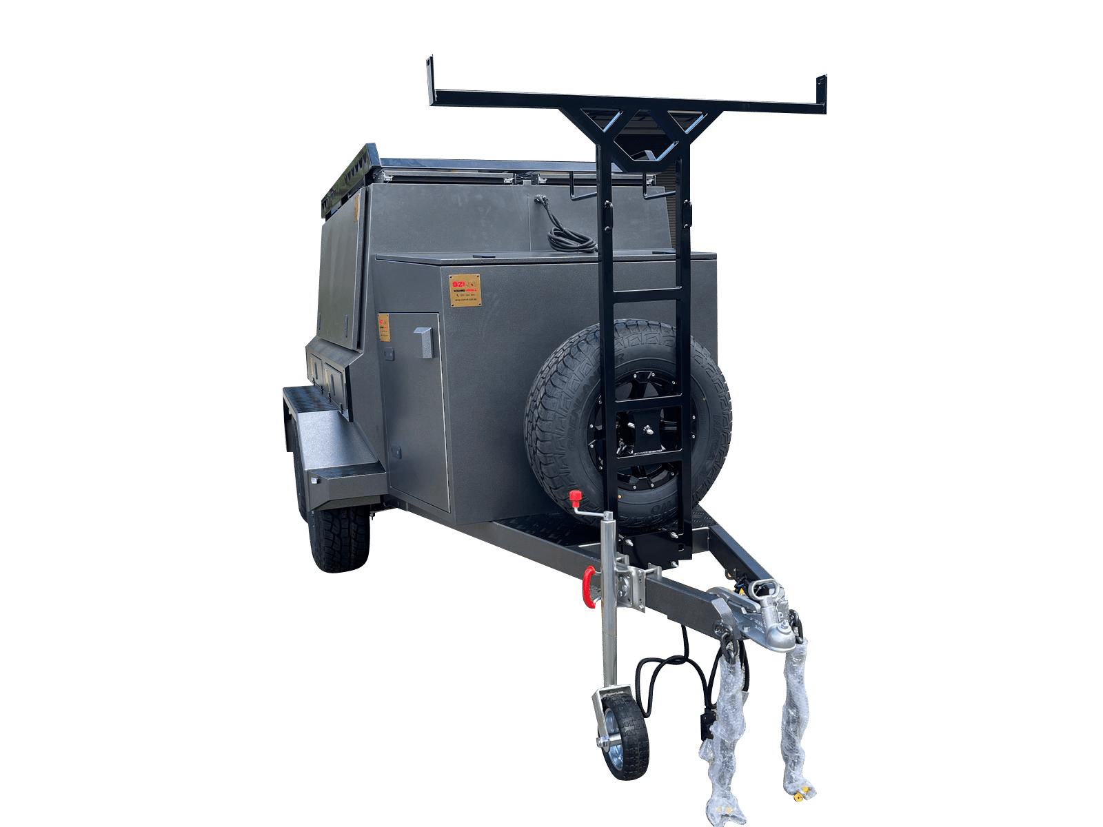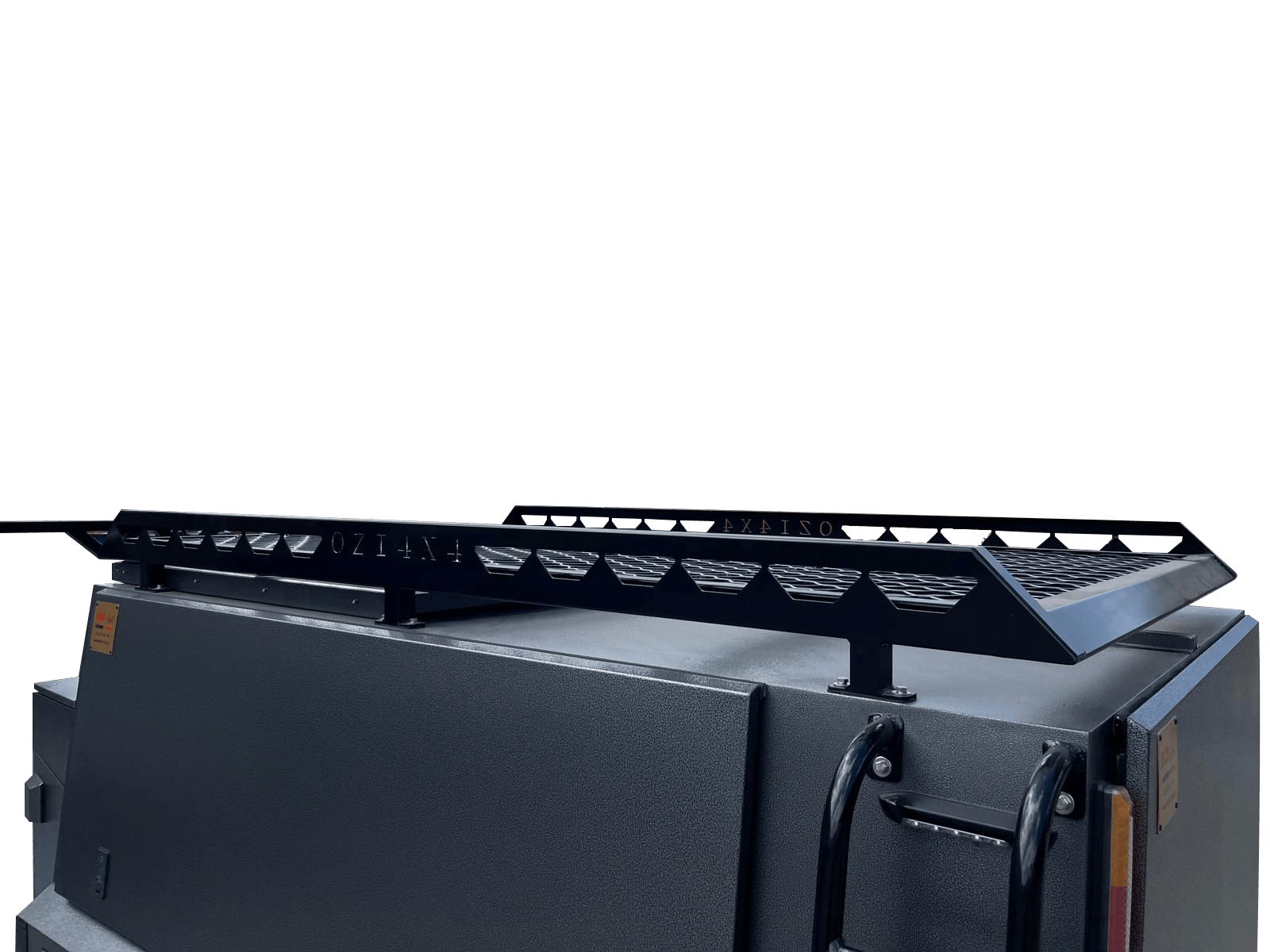 • Black ladder rack located at the front with a spare tyre.